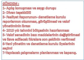 GÜNDEM : 1- Açılış konuşması ve saygı duruşu 2- Divan teşekkülü 3- Faaliyet Raporunun- denetleme kurulu raporlarının okunması, görüşülmesi ve vakıf yönetiminin ibrası 4- 2015 yılı tahmini bütçesinin hazırlanması 5- Vakıf senedinin bazı maddelerinin değiştirilmesi ve ilave edilecek fıkralara son şeklinin verilmesi 6-Yeni yönetim ve denetleme kurulu üyelerinin seçimi 7-Yapılacak çalışmaların planlanması ve kapanış.