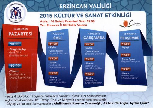 Valiliğimiz tarafından organize edilen “2015 Kültür ve Sanat Etkinlikleri” bugün saat 18.00’da İl Müftülüğü Konferans Salonunda düzenlenecek olan sergi açılışı ile başlıyor. 4 gün sürecek olan etkinlikler kapsamında klasik Türk sanatlarının seçkin örneklerinden hat, tezhip, ebru ve minyatür eserleri sergilenecek, Abdülhamid Kayıhan Osmanoğlu, Ali Nuri Türkoğlu ve Aydan Çakır’ın konuşmacı olarak katılımlarıyla söyleşi yapılacak, ‘Eskitilmiş Kılıç II. Abdülhamid Han’ isimli tiyatro ve ‘Rengârenk Dünyamız’ konulu çocuk oyunu gösterileri düzenlenecek.